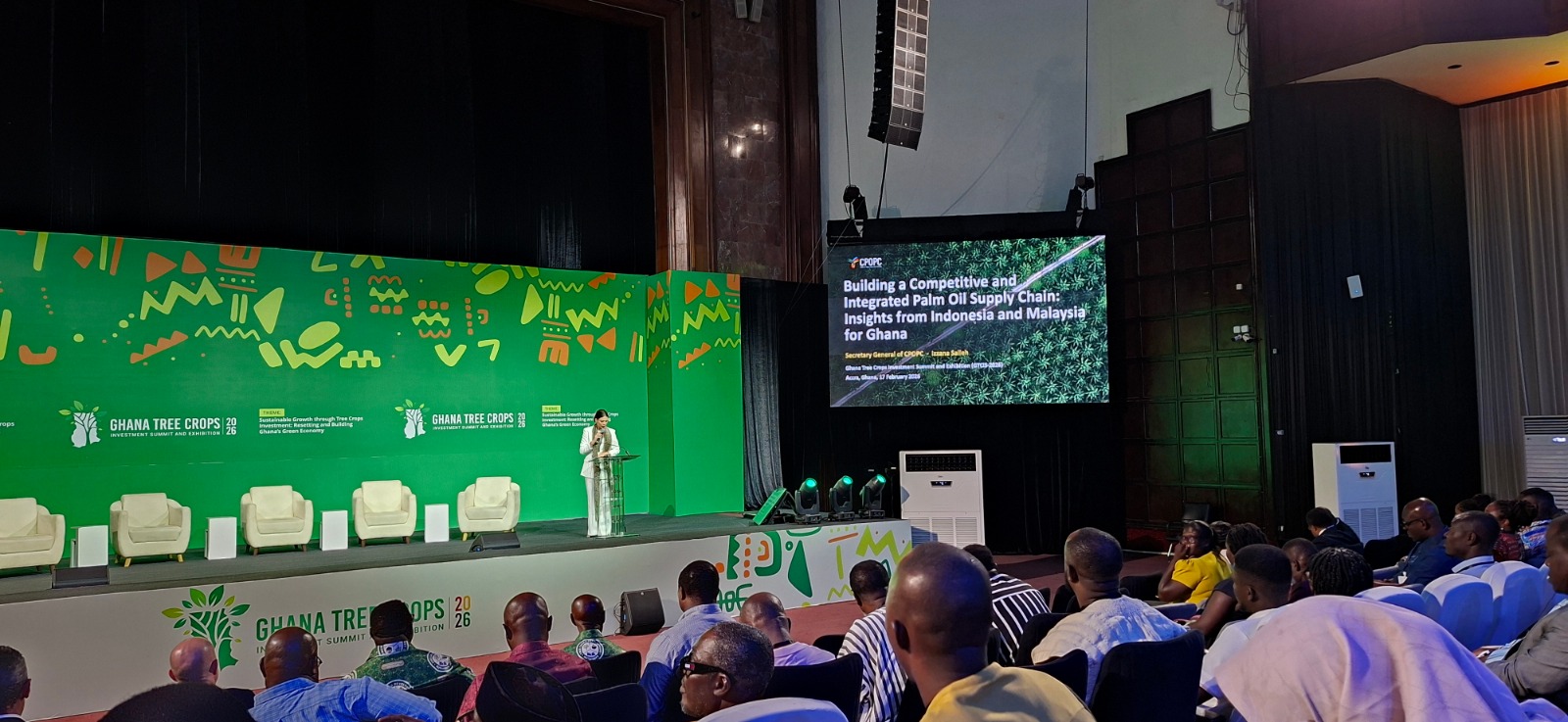 In Accra, CPOPC Secretary-General Madam Izzana Salleh participated in the Ghana Tree Crops Investment Summit & Exhibition (GTCIS-2026), 17–18 February 2026 and delivered remarks at the opening ceremony attended by H.E. President John Dramani Mahama, His Royal Majesty Otumfuo Osei Tutu II, and other distinguished participants. CPOPC underlined that Ghana’s tree crops have long anchored rural livelihoods and foreign exchange earnings, and that palm oil presents a timely opportunity amid rising vegetable-oil demand across Africa.